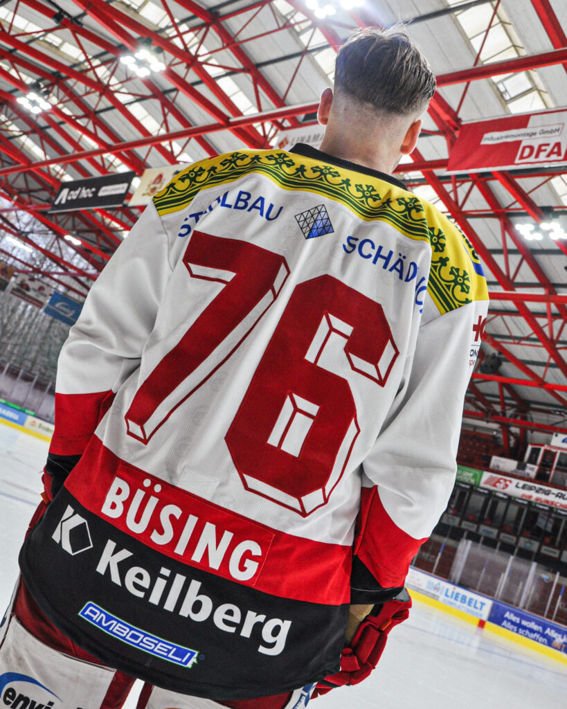 Ein besonders nostalgisches Element sind die Teile des Sachsen-Wappens auf den Schultern – eine Gestaltung, die Ende der 1990er und Anfang der 2000er Jahre häufig in der Arbeitskleidung des ETC Crimmitschau zu finden war. Auch die Schriftart der Trikots basiert auf dem damaligen Jersey-Design.